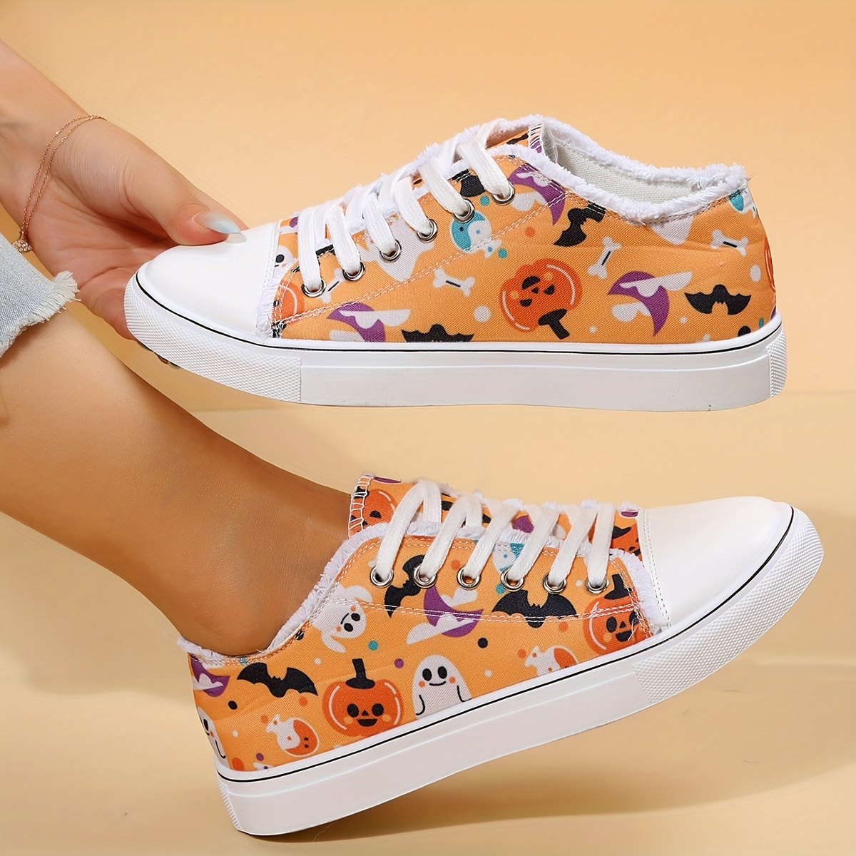 Women's Ghost & Pumpkin Print Sneakers, Halloween Lace Up Low Top Canvas Shoes, Casual Flat Skate Shoes