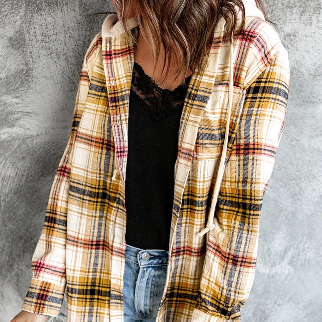 Women's Outwear Plaid Print Pocket Drawstring Hooded Jacket