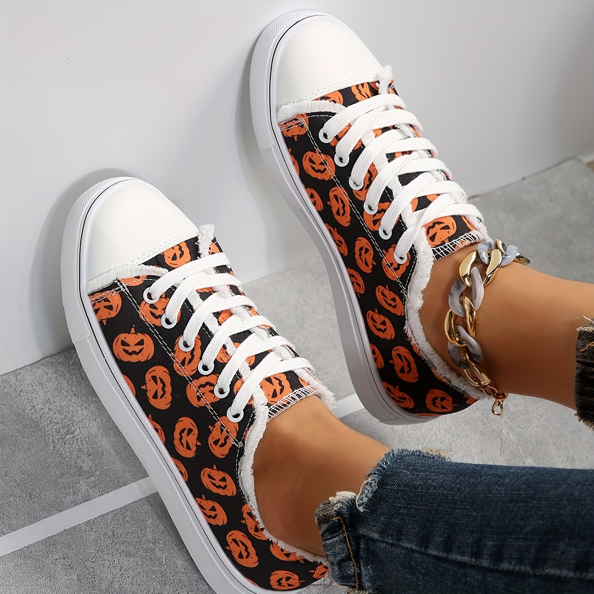 Women's Pumpkin Pattern Flat Shoes, Lace Up Low-top Round Toe Non-slip Casual Canvas Shoes, Outdoor Halloween Shoes